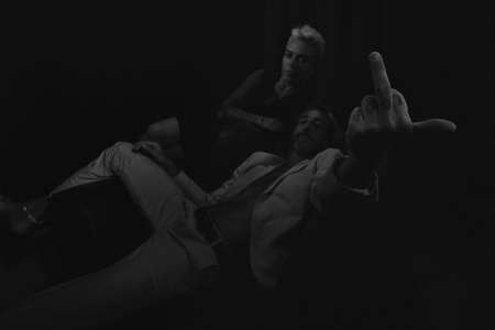 Man is using touch pad at home on sofa. Low key, black and white image.