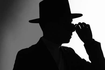 Silhouette of a man in a jacket and classial hat fixing sunglasses