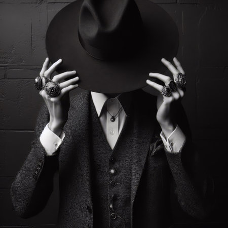 Black and white artistic shot of a mysterious person in a suit, covering face with a wide-brimmed hat, adorned with rings.. AI Generation