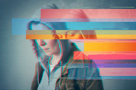 Glitch effect creates a distorted portrait with vibrant colors and sharp contrasts