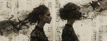 Baroque Fusion Fashion Collage: Digital Glitches and Sheet Music Backgrounds with Model Silhouettes