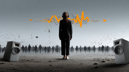 A woman dressed in business attire stands alone surrounded by a blurred crowd, listening to music with headphones. Abstract sound waves emanate from speakers, creating a contrast between solitude and a bustling environment. This image captures the essence of modern life, exploring themes of individuality, connection, and artistic expression.