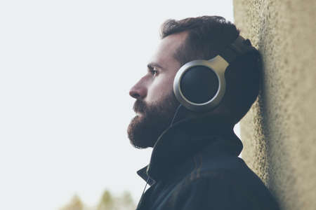 stylish bearded man in headphones listening to music