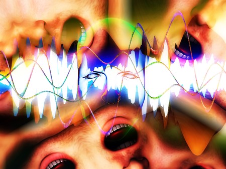 Conceptual image about mixed up soundwaves, mouths and music.