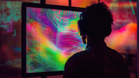 A focused image on a monitor displaying a matrixlike representation of data flows highlighted by bright colors demonstrating how AI algorithms dissect and interpret vast amounts o