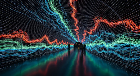 An obscured view of an immersive art installation and its enthralled viewers