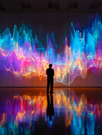 A person stands in the foreground, facing a massive light projection that illuminates the scene. The individual is bathed in the colorful glow, creating a striking visual contrast against the dark surroundings. The light projection dominates the background, casting intricate patterns and shapes.