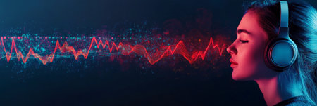 Young female singer composing a song using headphones and a futuristic interface visualizing sound waves, creating a concept of music technology and inspiration