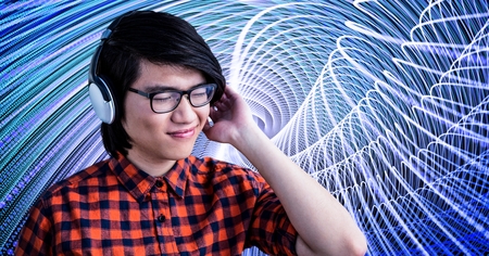Digital composite of Smiling hipster listening to music on headphones