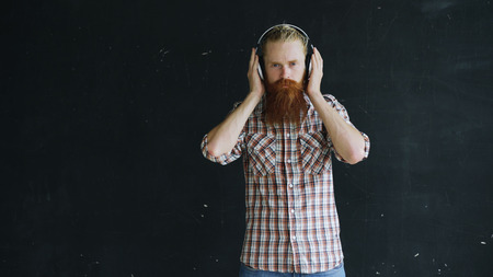 portrait of bearded young man with headphones looking into camera