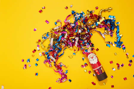 Colorful bright confetti and streamers with red party cracker on yellow background, top view. Copy space for text. Santa Claus on the clapperboard. Mood of Christmas and happy new year.