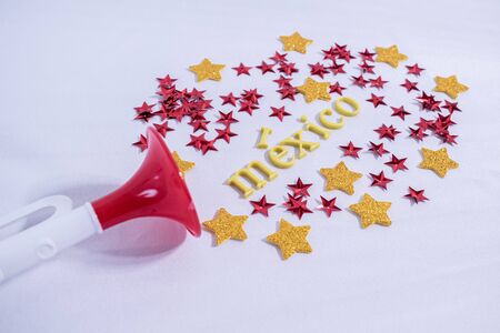 Trumpet, yellow and red stars and Mexico made from colorful letters on white background