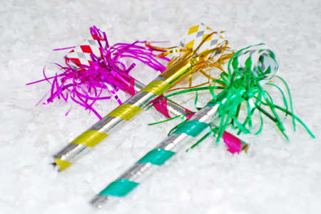 colored new years eve party horns in snow