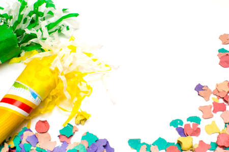 Multicolor party blowers on white background and confetti