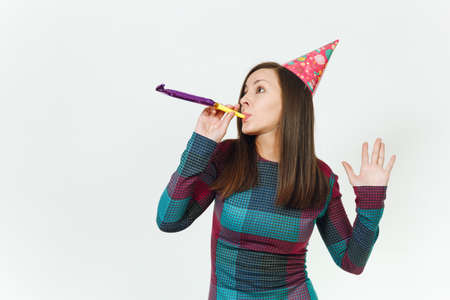 Beautiful caucasian fun young happy woman in plaid dress and birthday party hat with shy charming smile, playing pipe, celebrating and enjoying holiday on white background isolated for advertisement