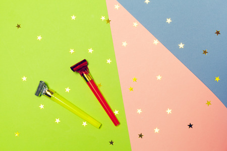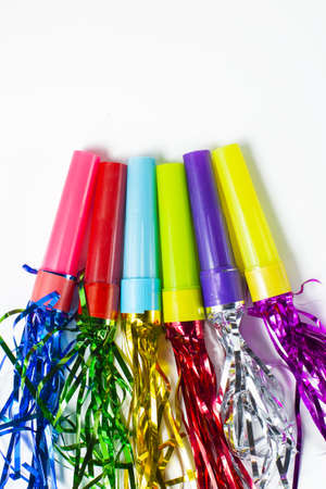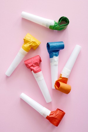 Colorful party blowers or noisemakers on colored background