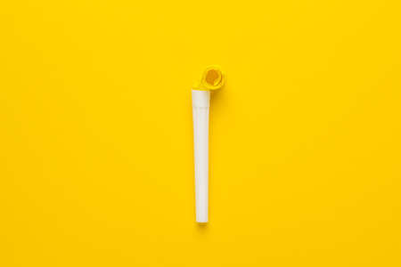 paper and plastic party horn on the yellow background