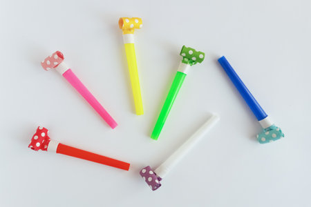 Multicolored whistles for birthday party chaotically on white background.