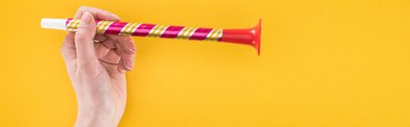 Panoramic shot of woman holding red party horn on yellow background