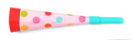 Party horn isolated on white, top view. Clown's accessory