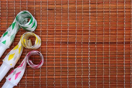 Penny whistles for celebrating of birthday and other holidays against a mat.