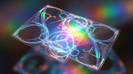 A complex transparent 3D structure with glowing blue circuitry and vibrant rainbow light refractions, suggesting advanced technology.