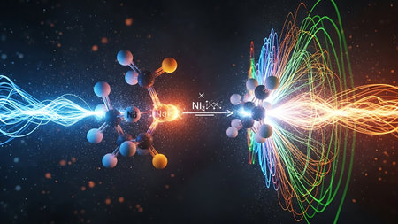 An atomic structure or a molecular model, central glowing nucleus surrounded by orbiting electrons spheres connected by lines, suggesting their paths or orbits.