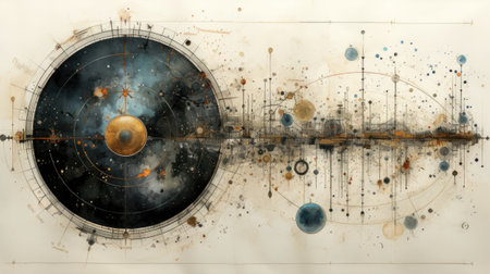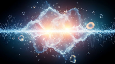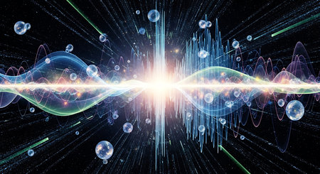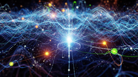 An abstract illustration showcases glowing spheres interconnected by swirling energy trails, set against a dark background. The artwork features a dynamic composition with radiant highlights and intricate details, suggesting motion and cosmic elements. Suitable for conceptual designs and projects related to technology or scientific themes.