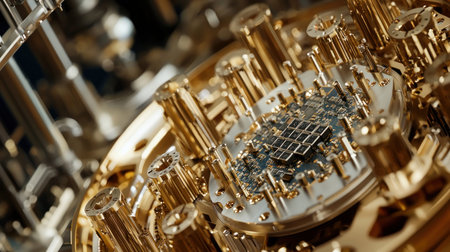 A close-up view of an intricate component from a quantum computer, showcasing the blend of metal and glass in a high-tech laboratory setting.