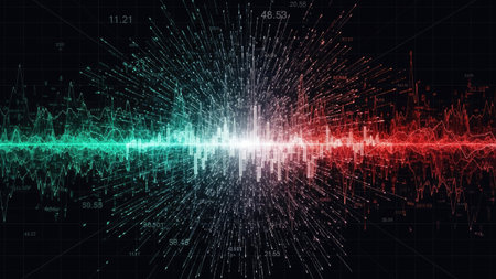 An abstract digital illustration showcases waveforms in red and green hues against a black backdrop. The composition features a central white light source, with the dynamic lines radiating outward. This graphic design is suitable for illustrating concepts of technology, data analysis, or visual communication, with applications in commercial and editorial projects.