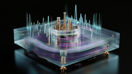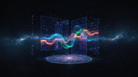 An artistic depiction presents a data visualization with vibrant wave forms, showcased within transparent digital interfaces. The composition features a dark background, highlighting the glowing lines and structures. The image suggests a technology or scientific concept, lending itself to editorial or commercial applications.