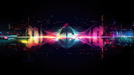 This image presents a vibrant visualization of sound waves in a digital environment. The composition features dynamic, colorful waveforms highlighted against a dark background. The scene suggests a technological setting with a focus on audio representation. It could be used for various projects related to music, technology, or data analysis.