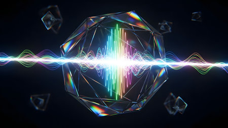 A detailed 3D rendering of a crystal structure emitting a vibrant energy wave, surrounded by smaller crystal fragments against a dark background.
