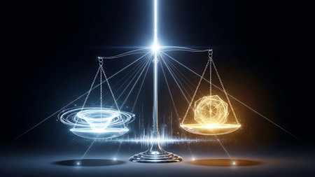 Digital illustration of balanced scales holding glowing blue and gold energy orbs against dark futuristic background with light beams, representing justice, balance, and cosmic harmony.
