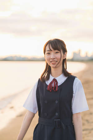 Asian female high school student walking on the beach