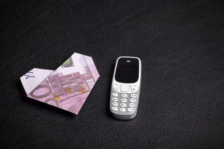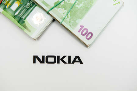 Paris, France - Nov 15, 2018: Stack of hundreds of euro banknotes currencies near Nokia icon on a connected device packaging - view from above