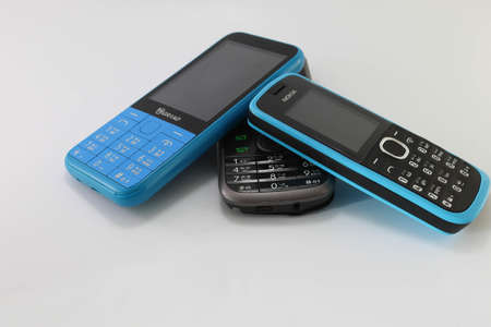 Bangkok, Thailand - December 10, 2019 Many used Nokia mobile phones model 3310 with keypad and touchscreen models on wooden floor.