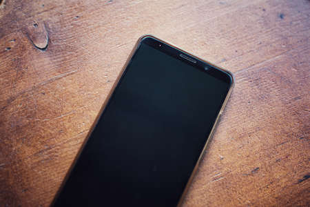 Close up shot of a smart phone on a wooden table, with shallow depth of field.