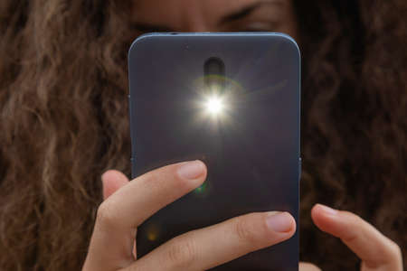 A young woman takes a photograph with a smart mobile phone, Spain.