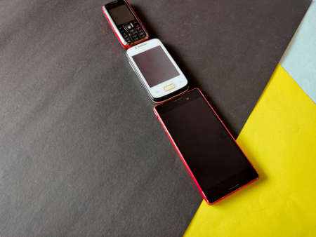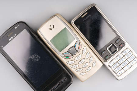 MOSCOW, RUSSIA-February 23, 2022: Old mobile phones closeup . They lie slightly rotated on a gray background. View from above