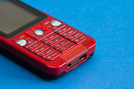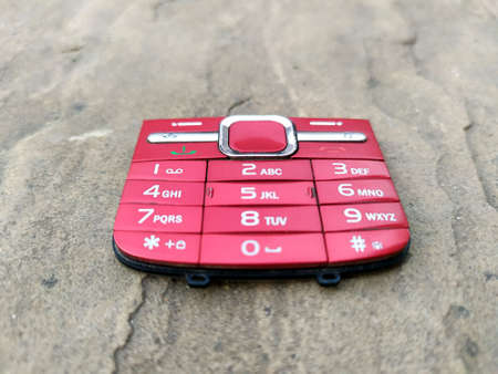 Selective focus on the keypad of a mobile. Beautiful red phone in Human hand. Keypad phone concept.