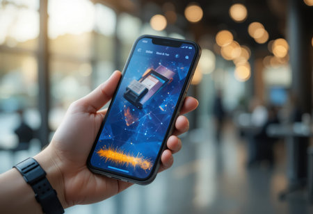 A person holds a smartphone showing sound visualization graphics in a stylish cafe during the day.