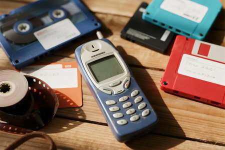 A nostalgic flat lay featuring an old mobile phone, retro cassette tapes, and a vintage film camera on aged wood. Perfect for retro tech, analog media, or nostalgia themed designs.