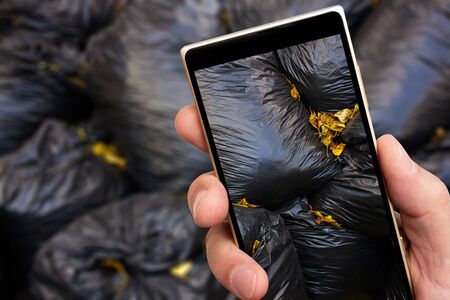 Garbage bags on smartphone screen. Garbage removal. Black trash bags.