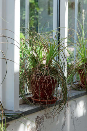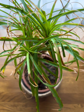 A drying house plant in a flower pot. The disease of the houseplant Beaucarnea Recurvata (Nolina). Leaves have brown spots and dry. Leaf blight or leaf spot. indoor plant problems.