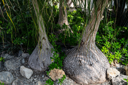 Examining diverse plant structures in nature, Tranquil subtropical setting showcasing hardy trees with rugged bases and lush foliage