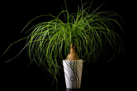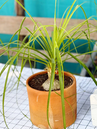 The Beaucarnea Recurvata, also known as Ponytail Palm, or Nolina is a houseplant with a swollen thick brown stem and the long narrow curly, green leaves flow up from this base.