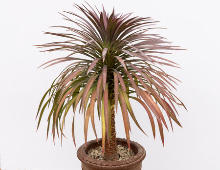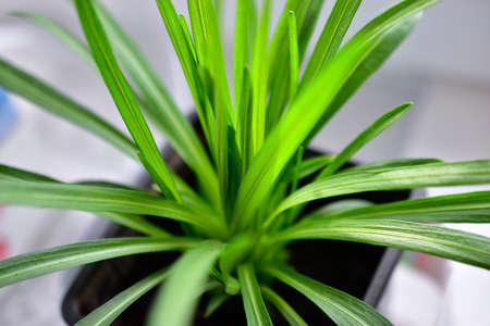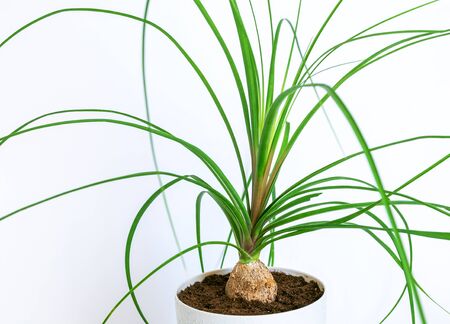 A close-up of the young nolin plant, bocarneya, against a white background. It is native to Mexico. Home crop production concept. Horizontal orientation, selective focus. soft focus.