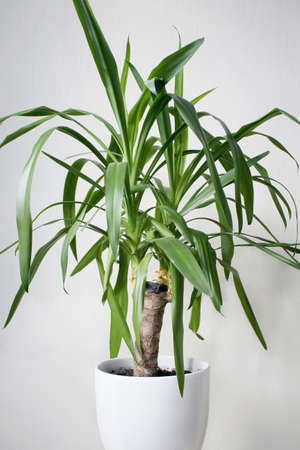 Southern palm or dracaena against a white textured wall. Southern vegetation, botany