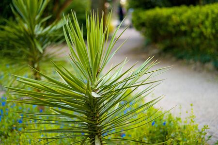 A fragment of a beautiful park with Yucca rostrata palms on a bright sunny day.